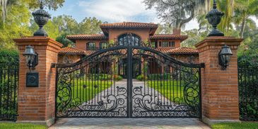 Our wrought iron gates are handcrafted for elegance and security, featuring custom scrollwork, arched tops, and integrated latch systems that complement your customized landscaping. These gates not only make a bold architectural statement but also enhance the beauty of concrete patios and work harmoniously with landscape lighting for a stunning outdoor space.